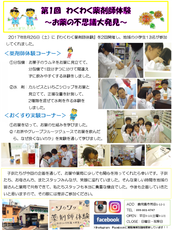わくわく薬剤師体験 開催 2017.08.26 第1回 わくわく薬剤師体験 開催日: 2017年8月26日(土) 場 所 : ゆうゆう薬局荒田店 (鹿児島市荒田1-12-1) 参加者数: 13名(同日2回開催合計)