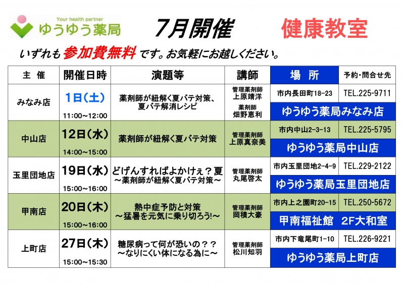 7月のゆうゆう薬局 健康教室開催予定一覧表
